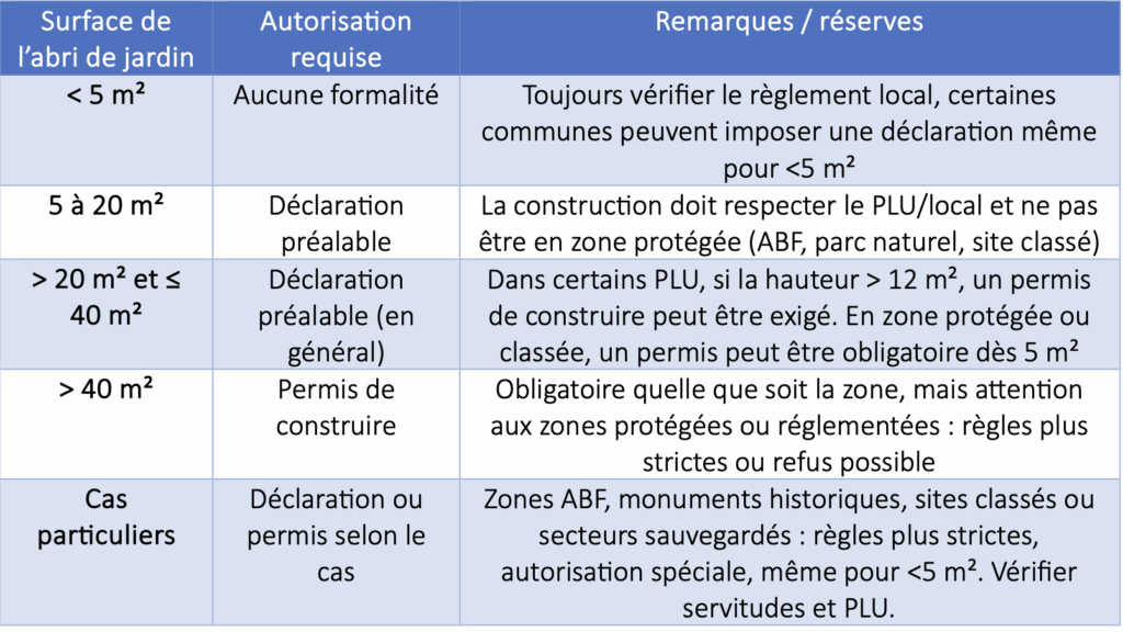 - Attention : Certaines communes exigent une déclaration même pour des surfaces < 5 m² si l’abri est situé en zone classée (ex. : secteur sauvegardé).